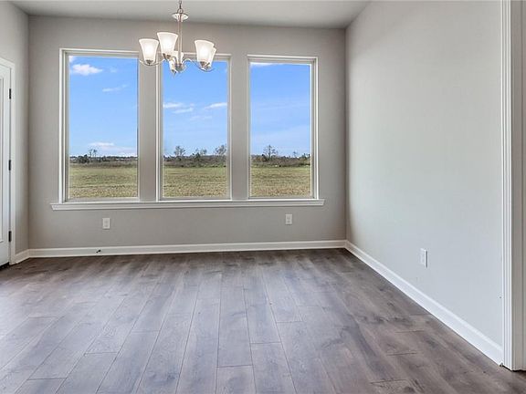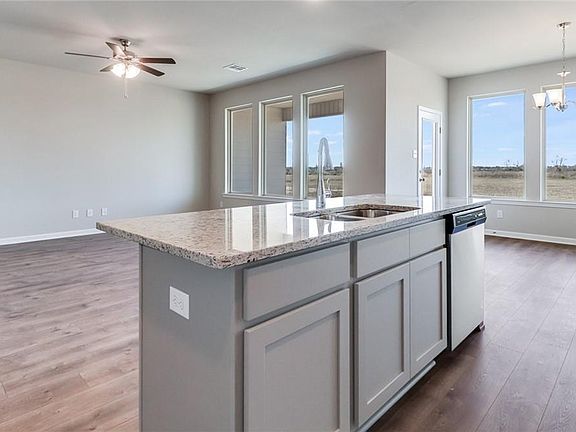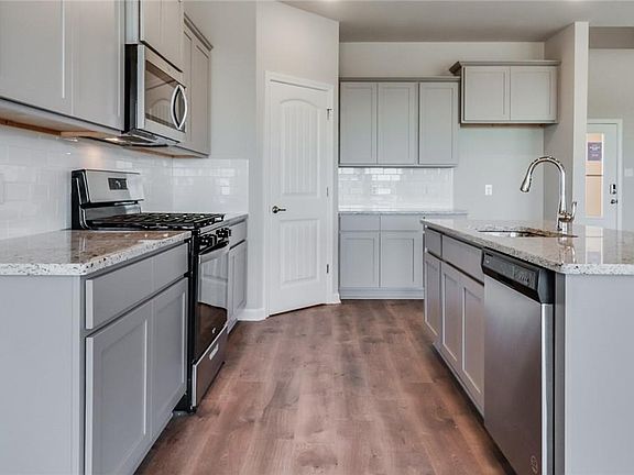'Oberlin EB' The Oberlin plan has a welcoming flow with 4 bedrooms and 2.5 baths. The open concept living, kitchen, dining area overlooks a corner back patio that is perfect for relaxing. The kitchen is designed with sleek cabinets, granite countertops and a subway tile backsplash and is equipped with stainless steel appliances that include a gas stove, dishwasher, and micro hood. This home is settled in Ridge at Morganfield, a new construction community with a Homeowners Association. This home comes with a 10-year warranty. All homes offer smart home automation, wood laminate flooring, fully sodded yards, and electric garages with garage door openers.