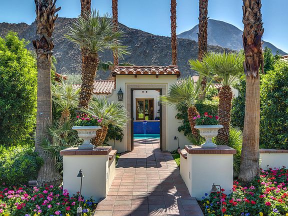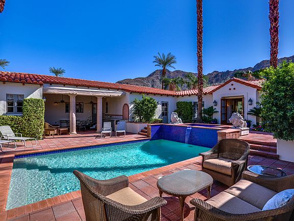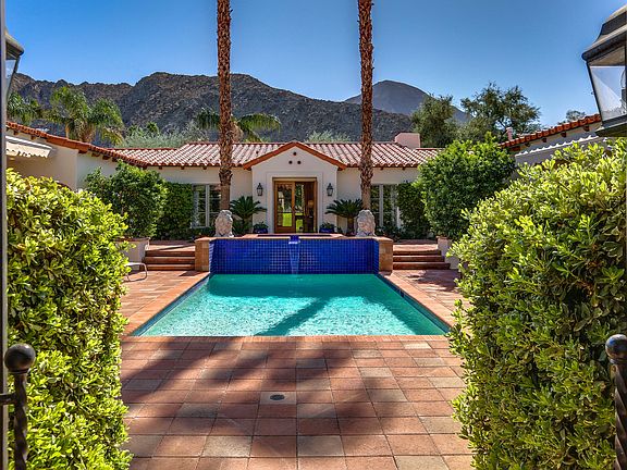 Eldorado Country Club ? The residence exudes a world of distinct charm that is replete with natural wood panel doors, pavers, and wide tiled corridors in a U-shaped floorplan. Custom metal doors open to the Entry Courtyard. Pavers, blue tiles in the pools, and the red tile roof create a charming ambiance for celebrations with family and friends. The living room is spacious. Vaulted open-beamed ceilings and a handsome fireplace create a genteel ambiance. French doors open to the patio and to views of the mountains and the golf course. The kitchen features a large butcher block center island with a vegetable sink; a 6-burner Viking gas stove, double ovens, and a SubZero refrigerator/freezer. In the Master Bedroom, the beamed ceilings have been repeated. Windows open to the Fairway and the Cove mountains. The study with attached bath can easily be converted into a fifth bedroom. This home is being sold furnished.