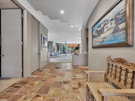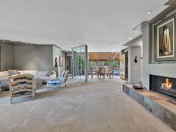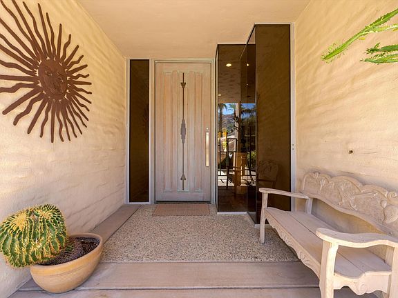 Welcome to your southwest oasis in the Desert! As you proceed through the large wood front door into the entry way, the stone tile floors welcome you into your spacious living/dining area complete with gas fireplace and separate wet bar. The views to the back patio, out to your beautiful pool and spa, gives you the option of indoor or outdoor living and dining. The kitchen is well appointed with Thermador refrigerator/freezer, induction cooktop, warming drawer, Dacor double ovens, an extra sink, appliance garage and wine refrigerator. The large island has plenty of space for preparing meals and room to sit. Kitchen is complete with a breakfast nook, looking out to the pool area, and has plenty of storage. There are 2 Master Suites on either side of the house, a guest suite with an added craft room and currently an office suite that can easily become the fourth bedroom suite. There is a powder room for your guests with a marble countertop. House has a laundry room, walk-in pantry, 2 big storage rooms off the garage, 2 car garage and a separate golf cart garage. Owned solar panels, gas BBQ and wind/sun activated awning on back patio.