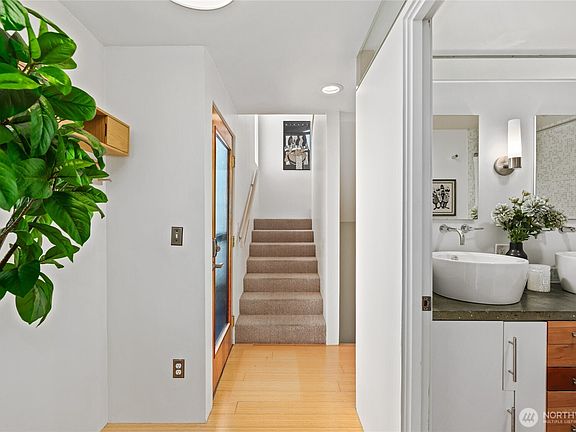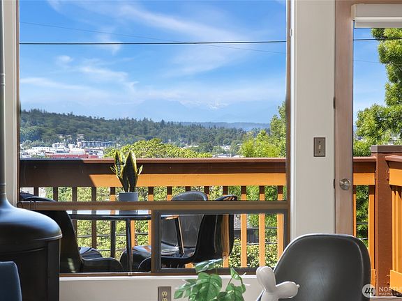 Stylish midcentury home offering modern comfort without sacrificing character. Enjoy an open layout with vaulted ceilings, bamboo floors, and a dedicated dining area. Cozy up beside the original vintage MALM Fire Drum on chilly nights. In summer, relax on the balcony with unobstructable Ship Canal & mountain views. The remodeled bathroom features a soaking tub, custom cabinetry, high-end tile, and sleek finishes. A/C on both levels & new H2O heater. The one-car garage provides secure parking and space for storage or projects, plus three off-street spots. Or skip the car—you're just steps from PHRELARD (aka the center of the universe). Walk to breweries, eateries, eclectic shops, live music, Green Lake, Lake Union, the Ship Canal, and more.