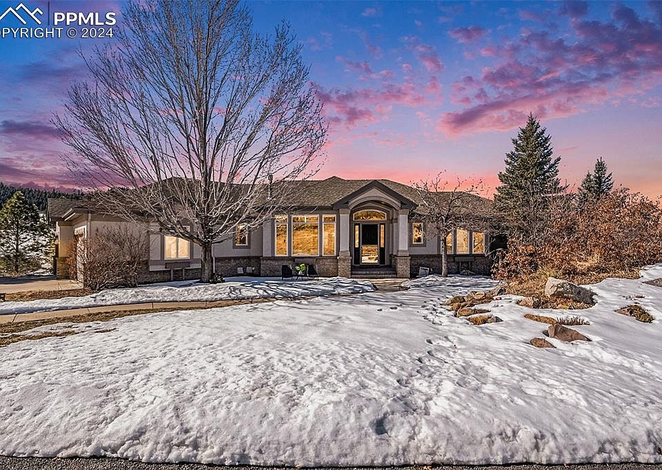 Discover the epitome of elegance and comfort in this immaculate, newly updated custom ranch home nestled in the prestigious Bell Mountain Ranch. Occupying a generous 3.7-acre lot, this property boasts unparalleled mountain views and backs onto open space, ensuring privacy and stunning scenery. Experience the grandeur of high ceilings throughout the home, adding to the open and airy feel. The thoughtful open floor plan is highlighted by a main floor primary suite with walkout access to an extended deck, a luxurious 5-piece spa-like bathroom, and two spacious walk-in closets. A guest ensuite on the main floor adds to the home's allure, offering a private bath perfect for visitors. Vaulted ceilings grace the living room, complemented by a cozy gas fireplace and expansive mountain views, while the recently updated kitchen is a chef's dream with new appliances, including two ovens and a built-in beverage refrigerator. Wood flooring and newer carpet flow throughout, alongside new light fixtures and ceiling fans, ensuring modern comfort. The residence is equipped with two HVAC systems, water heaters, and a sophisticated 2-stage water filtration system. The finished walkout basement is an entertainer's paradise, featuring an oversized great room, a state-of-the-art home theater with 7.1 surround sound, direct access to a covered patio, and three guest bedrooms—one with its own private bathroom—providing ample space for guests or family. Mounted TVs, TV wall mounts, and all built-in and freestanding speakers convey, ensuring a premium entertainment experience. The extensive professional landscaping in both the front and backyard creates a breathtaking setting that complements the serene mountain and open space backdrop, offering a peaceful retreat perfect for outdoor living and entertainment. With every detail meticulously updated, this home sets a new standard for luxury ranch living.