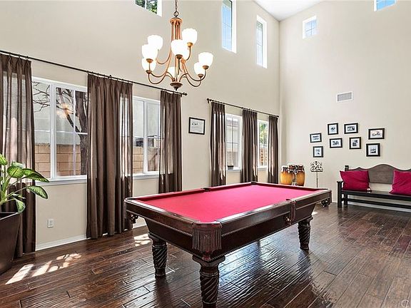 Located in the desirable community of Wolf Creek, this former model home is packed with upgraded features. The downstairs flooring is adorned with distressed hardwood throughout the living room, dining room, family room and adjoining kitchen. The kitchen with large walk-in pantry, has granite counters, including the large island and the entire backsplash. All appliances are Stainless Steel including 2 ovens, and the professional 6 burner cooktop. The family room, open to the kitchen includes a fireplace with open views into the backyard. The living room with its 2 story high ceiling provides an open and airy ambiance. One bedroom and full bath are on the main floor with 3 bedrooms upstairs. The well separated master bedroom includes dual walk-in closets while the adjoining bathroom includes dual sinks and a jacuzzi style tub. The backyard is truly fit for the professional chef with entertainment in mind. 2 custom built BBQ stations, one being wood burning, your own vegetable and herb garden, and fruit trees. Privacy is enhanced for there are no homes behind. This tandem 3 car garage home is ideally located walking distance to all top-rated schools, including Great Oak HS. Shopping, restaurants, Pechanga Resort, the I-15 freeway and Temecula Wine Country are minutes away.