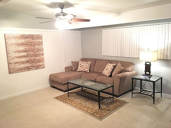 1 bedroom plus den with privacy option for second bedroom. Fresh paint, granite kitchen with island, and new window treatments. Main bath with updated vanity, new flooring and 12x24 shape tile in tub/shower. New lighting, some mirrors, all new hardware throughout. Updated with midcentury bones for a light bright airy feel. Fruit trees galore, Inviting pool off patio, and close parking in the carport with storage area.