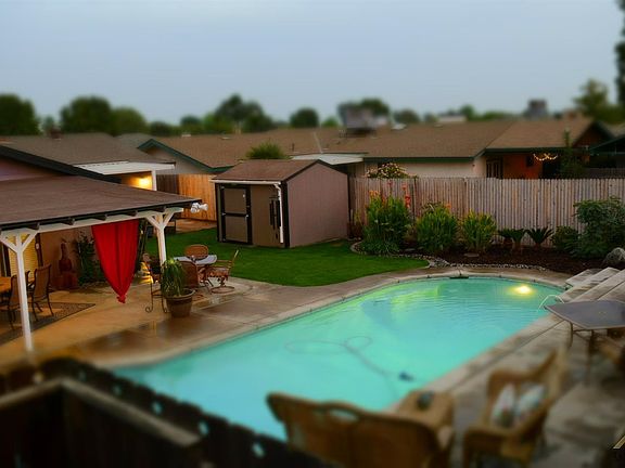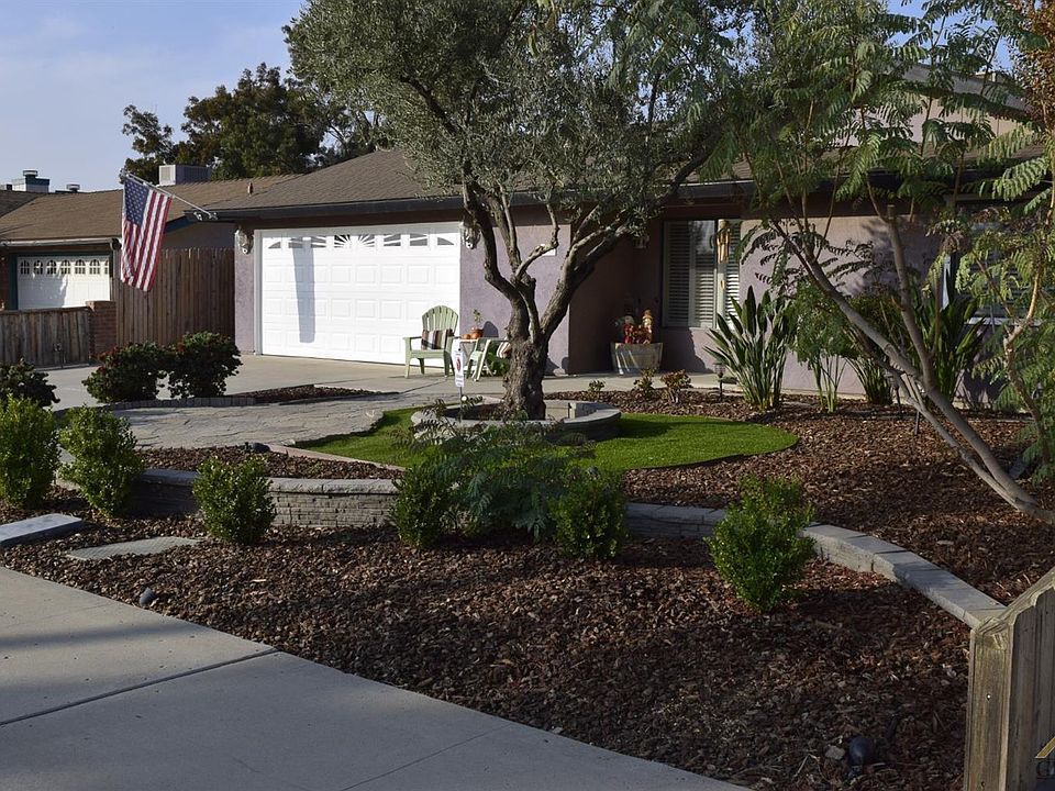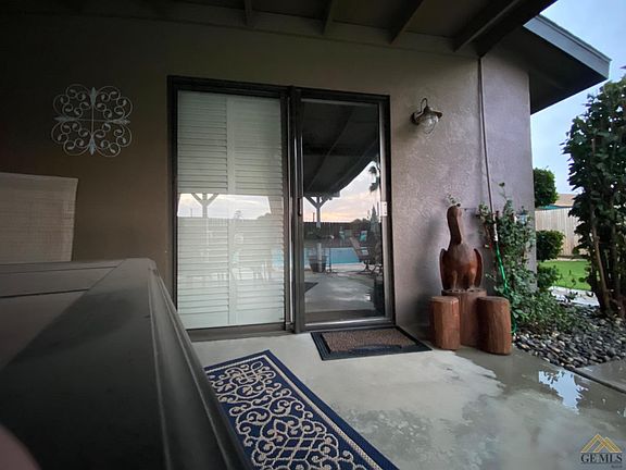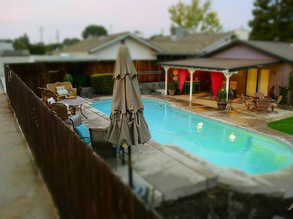 As soon as you walk through the door, you'll know you're home. Plantation shutters throughout allow plenty of natural light in, as well as provide privacy when needed. Show off your culinary skills in the newly renovated kitchen which boasts a large sink with electronic faucet, stainless steel GE Caf appliances, walk in pantry, and breakfast bar. Tile flooring enhances the main living quarters, while plush carpet adds to the comfort of the three bedrooms. The master suite boasts a private bath, floor to ceiling mirrored closet doors, and generous sliding glass door opening to the beautiful backyard. When it is time to entertain outdoors, you'll find two covered patios, a custom in-ground pool with waterfalls, and tiered cement deck surrounded by well manicured landscaping. The front yard features an old grove olive tree with modern no mow landscaping. Enjoy the finished garage with workbench and plenty of storage. Indoor laundry and security system complete this dream home package