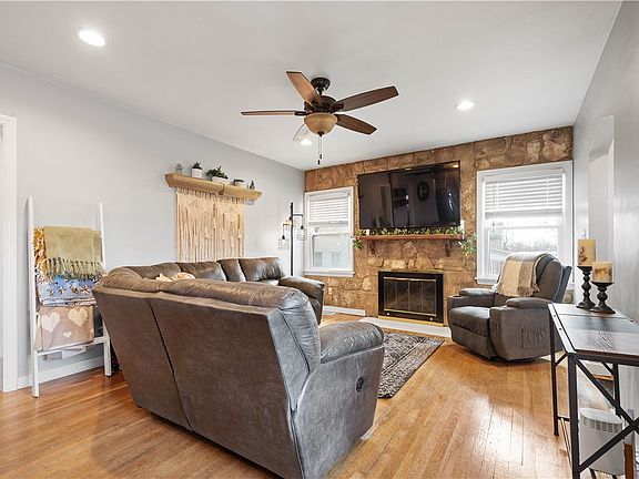 Prepare to be amazed by this beautifully updated open-floor-plan home! The living room is highlighted by a striking stone wall and decorative fireplace, creating a cozy yet stylish space. The open dining area flows seamlessly into the updated kitchen, featuring classic subway tile backsplash, crisp white cabinetry, butcher block countertops, and a stunning wood cathedral ceiling. A beautiful staircase leads to the second-floor den and master bedroom, which can also serve as a family room, office, or playroom! The first floor includes an updated full bath and two additional bedrooms. The lower-level game room is perfect for game day or can be used as an extra bedroom. Plus, the unfinished basement space provides plenty of storage. Step outside to a private rear patio with a waterfall pond, overlooking an expansive backyard - perfect for quiet time, gardening or fun and games. This is the one you’ve been waiting for!