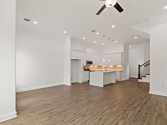 Open floor planStained hardwood stairsRecessed lightingDurable vinyl flooringWrought iron gate