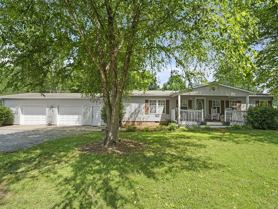 Adorable, well-maintained home! Just under 3 Acres. Enjoy the landscaped view from the covered front porch. Spacious foyer. The great room has a cathedral ceiling and a beautiful rocked fireplace. Large eat-in kitchen w/ tons of cabinets and counter space. Pantry and laundry off of the kitchen. Dual primary suites, double vanities & large walk-in closets. Enjoy a standalone shower or soak in the garden tub. Sunroom off of the great room through the French patio doors. The oversized attached two-car garage provides ample storage and two pedestrian doors for convenience. Approximately 2 acres fully fenced in. Gutter-guards for low maintenance. A must-see!