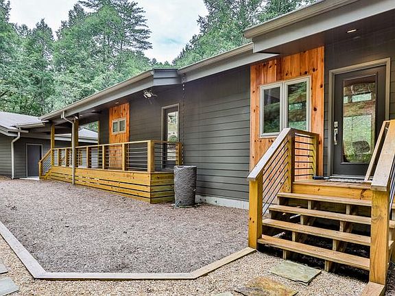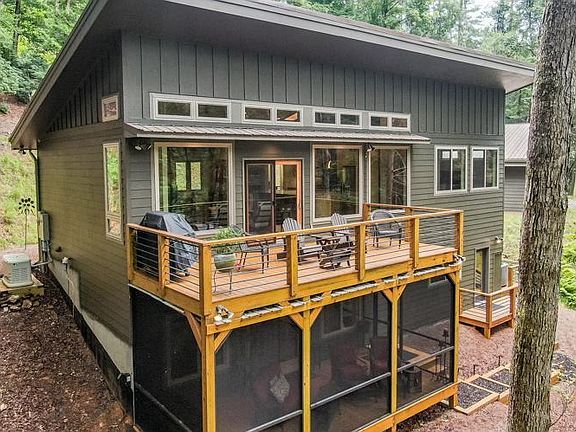Amazing river front contemporary home in exclusive Cherry Log community of Goose Island Hideaway-- conveniently located between Ellijay and Blue Ridge. Approx. 400 feet of dynamic Ellijay River property with great balance of rocks and water noise. Very private setting. Like new home loaded with upgrades which will not disappoint! Great house for entertaining including a Bocce Ball court in the backyard and plenty of room for guests! Tons of windows and natural light throughout, 2 large decks (one screened in), full finished walk out terrace level with wet bar area, Murphy bed and more. Upscale kitchen w/soft close cabinets, upgraded appliances. Granite throughout home. Modern sleek style. Oversized 2 car garage. EZ maintenance home w/concrete board ext and metal roof. Built eco friendly(low electric bills) Whole house generator.