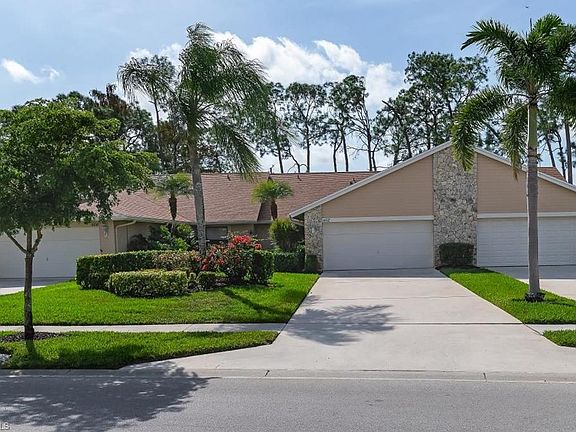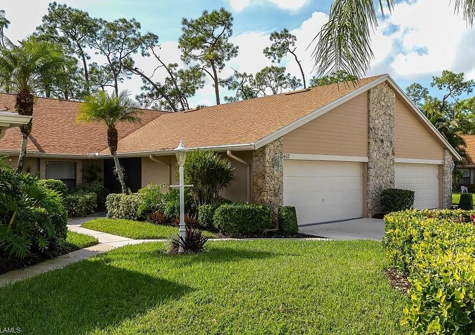 New roof & skylights 2017, Exterior painted 2016. New heating & A/C 2009. New water heater 2018. Kitchen remodeled December, 2012 with granite counters, refaced cabinets, stainless refrigerator, cooktop stove and built-in microwave. Crown molding in LR, DR and master bedroom. Comfort toilets both baths. Hurricane rated sliders on lanai. Tasteful turnkey furnished unit with a few exceptions. Extra refrigerator and cabinets in the two car garage. Peaceful views of golf course and landscaped area from screened and tiled lanai. Own you own golf cart. 27 holes Arthur Hills championship golf included with no initiation fee. Clubhouse with fitness facility, library, full service restaurant, grill room, Pro Shop, driving range, two putting greens, practice sand trap area, bocce, pickleball, 3 Har Tru tennis courts and lap pool. 5 miles from downtown 5th Ave. shopping, dining, art galleries, live theater and pristine Gulf of Mexico beaches. 25 min. from Regional SW FLA airport. Easy access to I-75 No. and So. Close to Marco Island.