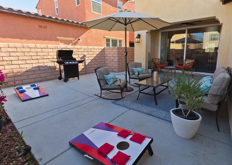 12 month or seasonal monthly fully furnished lease. Available NOW. 2506 sq. ft. four bedroom, three bath Spanish Walk home has been upgraded and is gorgeous. Great outdoor space. Newly built in 2015, the downstairs is an open-concept plan, with natural light, including a gourmet kitchen, formal dining area and family room with a fireplace and private bedroom and bath. Ceramic tile flooring throughout. Upstairs includes Master bedroom and bath on one side of the home, laundry room, large entertainment room/loft separates the Master from other two bedrooms and bath. Three-car tandem garage with epoxy flooring. Three pools, spa, playground, large grassy area for soccer, football, or just running in the grass, a picnic area, Clubhouse with kitchen and eating area for larger groups, meeting room, billiard room, fitness room. Great location with easy access to shopping, dining and the freeway. Not a 55+ community.