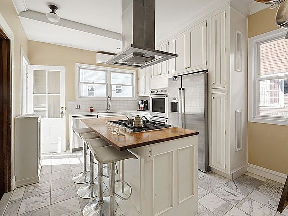 Nestled on a serene, tree-lined street, this residence effortlessly blends historic charm with modern upgrades. The parlor floor showcases original parquet floors, a restored fireplace mantel, intricate wainscoting, stained glass accents, and pocket doors that lead to the bright living and dining areas. The chef’s kitchen, perfect for culinary adventures, features custom cabinetry, quartz countertops, Thermador double ovens, a Bosch refrigerator, and a stunning Wolf six-burner cooktop atop a butcher-block island. Off the kitchen, a butler’s pantry with built-in cabinetry and a wine fridge offers added convenience, while the back door leads to a large deck and private garden, perfect for outdoor dining and relaxation.
