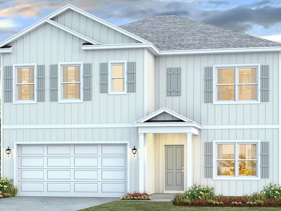 Bayside at Ward Creek is at the heart of Panama City Beach, accessible by sidewalk to Pier Park, Frank Brown Park, and the Conservation Park with the Gulf of Mexico less than 3 miles away. | The Carol plan is a 2-story home featuring 4 bedrooms, 3 bathrooms and EVP flooring throughout. On the 1st floor is a beautiful kitchen with quartz countertops and Ivory Shaker Cabinetry, a flex room, one bedroom, and one bathroom. On the 2nd floor you will find the spacious primary bedroom with a large en-suite that boast a modern tiled shower, bathtub and a large closet. Also on the 2nd floor is the laundry room, a den and 3 bedrooms.