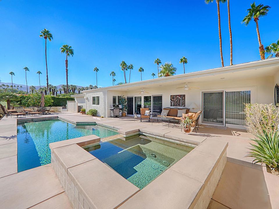Stunning, Remodeled South Palm Desert Condo with PRIVATE POOL, Mountain, Golf Course and Pool Views located on Historic Shadow Mountain Golf Course. Designed by the Famous Mid-Century Team of Wexler/Harrison, this TURNKEY CONDO features 2 Primary Bedrooms, 2 Bathrooms and an Open Floor Plan. In addition, there is a cozy Den with gas log Fireplace. Stainless Appliances, Slab Granite Counters and Gorgeous Cabinetry grace the Galley Kitchen. Both Bathrooms have large Walk-In Showers, Granite Counters and lovely Cabinetry. Other Exceptional Features Include: Double Paned Sliders and Windows, Plantation Shutters, 20 inch Neutral Tile Flooring with Carpet in Bedrooms and Den, Spacious Walk-In Pantry, Breakfast/Cocktail Bar, Tankless Water Heater, 4 Skylights, 4 Ceiling Fans, 2 CAR GARAGE (ONE OF THE FEW UNITS IN COMPLEX WITH 2 CAR GARAGE), This unit is being SOLD TURNKEY FURNISHED (BEAUTIFUL/QUALITY) PLUS GOLF CART! Low HOA Fee of only $255/Month includes Front yard Maintenance, Exterior Painting, Street Maintenance and Insurance. Just a few blocks from famous El Paseo with World Class Shopping and Fine Dining, this Condo Has it All! OPEN HOUSE SUNDAY, DEC. 4TH FROM 12-3.