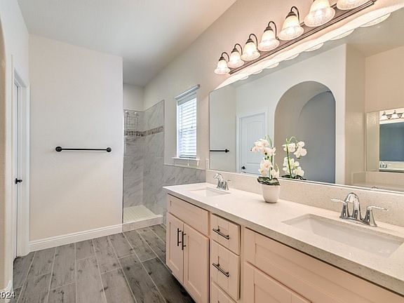 Stunning home in the gorgeous Artesia neighborhood. This spacious 4-bedroom home offers 3 bathrooms, dual primary bedrooms, and a 3-car garage. The 2,114 sq. ft. property features a storage shed with power and lighting, RV parking, and a block wall for added privacy. Enjoy beautiful mountain views from the covered patio. The vacant lot next door offers additional space and potential. The community includes a dog park, perfect for pet lovers. The home also comes equipped with a water softener. A perfect blend of comfort and convenience!