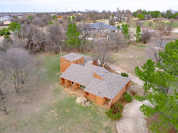 Contemporary Redwood home, nestled in the sought-after Grandview addition, sits on 2.07 acres on a cul-de-sac. Designed by Norman architect W. Haskell Olivo, influenced by Frank Lloyd Wright and Bruce Goff, this unique home boasts redwood siding, a pier and beam foundation, and Wood Mode cabinets throughout. Cozy two living areas, an inglenook, galley kitchen, and a loft used as a bedroom, it offers versatility and style. The primary bedroom suite, two efficient bedrooms with shared bath, and a family room enhance the functional layout. No Basements or Attic. The three-car garage, home office, and over 2,700 square feet of space make this residence truly exceptional. Noteworthy features include a French drain on the East side of the property and a new roof installed in 2022. Original architecture plans and plans for an addition add value to this one-of-a-kind property.