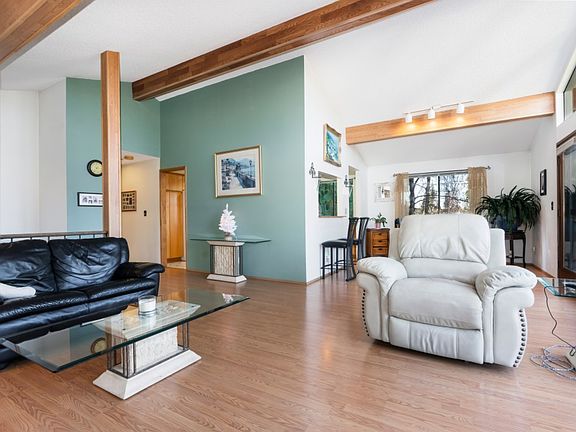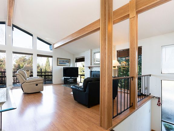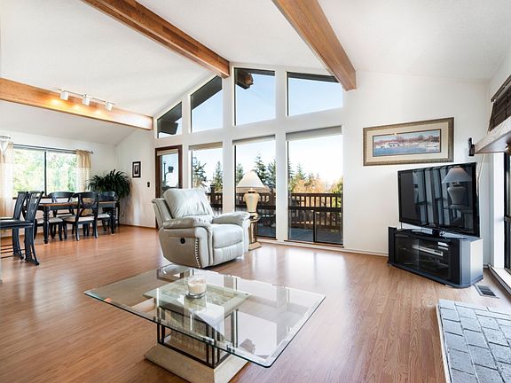 Welcome to this well maintained light-filled home on a quiet cul-de-sac. Enjoy sunsets from your deck with a peek-a-boo view of the water. Vaulted beam ceilings add a nice contemporary touch with wall of windows filling the living and dining areas with natural light. Wonderful fenced backyard with second deck for entertaining. Finished basement with bonus room and 1/2 bath. This home features a newer roof, water heater, furnace, gas fireplace, stove and fridge. Large 2 car garage w/ RV parking.