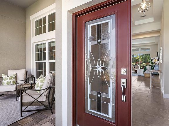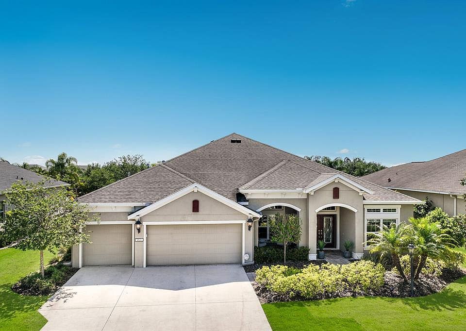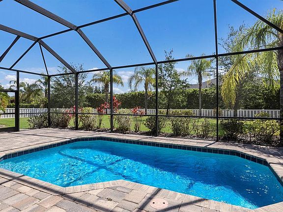Boasting an air of sophisticated charm, this Cardel custom home offers one of the largest fenced back yards in Central Park at Lakewood Ranch, and is meant for a discerning lifestyle with serene Florida comforts. This capacious residence fulfills your family's needs with beauty and grace, from hosting get-togethers to everyday living. Exquisite finishes, thoughtful details, high coffer-accented ceilings, versatile spaces, and harmony with the outdoors are felt the moment of entering. Stunning glass double doors draw you inside from a quaint front patio to spacious interiors that still bestow a sense of intimate privacy throughout the great room floorplan. Cool neutral colors showcase the chef's kitchen and vibrant landscaping beyond the screened lanai. The kitchen centers the home with an expansive island with bar seating, rich wood cabinetry, fresh backsplash, stainless built-in appliances including a gas range, wine rack, beverage cooler, and butler's pantry in the juxtaposed dining room. Meeting today's diverse expectations, this home was imagined for excitement, efficiency and extravagance. The split layout grants separate wings of domains where the three guest bedrooms reside on one side and the owner's suite on the other. Rejuvenating and indulgent, the owner's suite features walk-in closets, lanai access, and en-suite bath with a soaking tub with an impressive walk-in shower. A large study/den is ideal for tending to responsibilities as well as accommodating preferences such as a guest room, hobby area, or office. Built-ins and generous storage options throughout the home make life easier, including the three-car garage and inside laundry room. Outside, the screened lanai is a sanctuary for making memories encompassed by an ample fenced backyard where kids and pets can roam freely when they aren't splashing in the pool while the grill master barbecues in the summer kitchen. Your family will appreciate the proximity to A-rated schools of Lakewood Ranch, shopping, dining, activities, gyms and more. Central Park is a highly coveted, laidback community families adore with parks, nature trails, a sports complex, concession stand, dog parks, playgrounds and splash pad, and monthly social events.