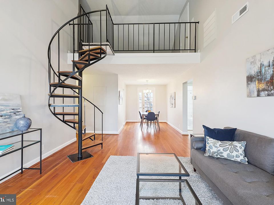 ***Offer Deadline set for Monday, December 16th at 12pm (noon).*** Beautiful 2 bedroom, 1 bathroom Sherwood model home nestled in Fairlington Villages! The light-filled living room features vaulted ceilings with a ceiling fan and overhead lighting, gleaming hardwood floors, & fresh paint throughout. The updated kitchen is accented with white cabinetry, granite countertops, subway tile backsplash, recessed lighting, & newer stainless steel appliances (2021). The spacious separate dining area has a chandelier and provides access to the serene outdoor balcony - perfect for relaxing on a warm day. The primary bedroom features crown molding, a ceiling fan with overhead lighting, and a large closet with a custom Elfa shelving system. The second bedroom also includes a ceiling fan & a large closet with Elfa shelving. The updated bathroom is accented with gorgeous marble-inspired tile flooring, a white vanity, contemporary fixtures, & a sparkling tiled shower. Back in the living room, a spiral staircase leads up to the carpeted loft with a HUGE floored walk-in attic with tons of storage space. Other features include a laundry nook with a newer stackable full-size washer & dryer (2021), a newer HVAC (2021), and two reserved parking spaces. Fairlington Villages amenities include six pools, lighted tennis courts, tot lots/playgrounds, walking paths, & MORE! Great location near I-395 & the shops and restaurants of The Village at Shirlington, West Alex, Baileys Crossroads, Del Ray, & Old Town Alexandria.