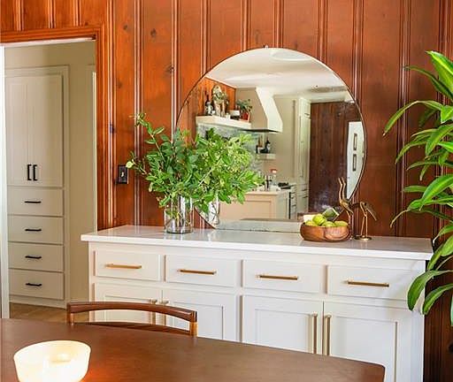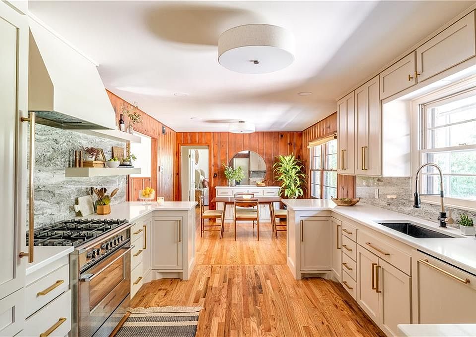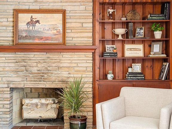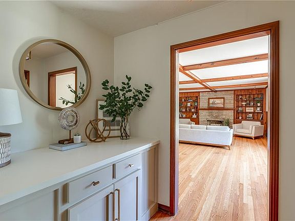A rare OKC find; Mid-Century Modern ranch nestled on a wooded lot. The updated interior features clean lines & vintage woodwork. Light-filled main rooms provide a flexible layout; wonderful spaces for entertaining & displaying artwork. Impeccable finishes throughout include a gourmet kitchen, quartz countertops, stunning marble backsplash & custom cabinetry, beautifully remodeled bathrooms & formal living with coffered wood ceilings & original stone gas fireplace flanked by built-in shelves. The ingenious division of the bedroom spaces is perfect for extended family, live-in Nanny or to provide teenagers with more privacy. Two overly-sized bedrooms with bathrooms are located in the original floor plan. A large bedroom with en suite bath & an additional room with a private entrance. A unique property of incredible modernist character & design; the backyard includes a covered deck with custom-built fireplace, climate controlled 20x40 shop & gated entrance from side street.