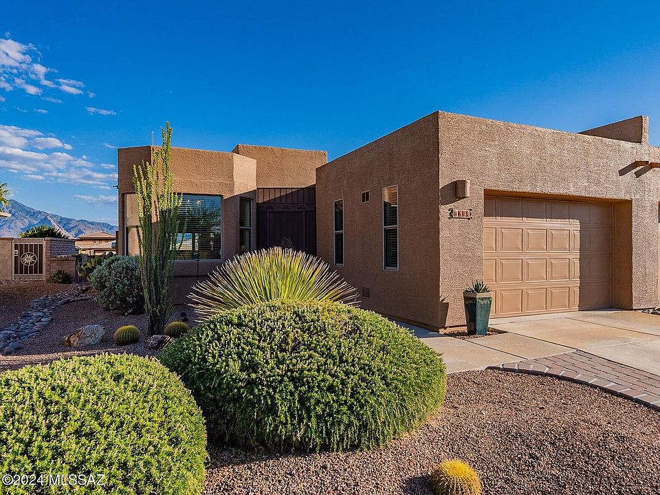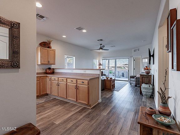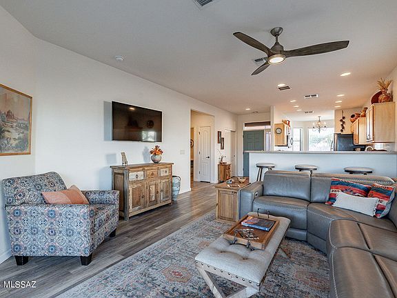 An easy-care lifestyle is just waiting for you! A metal security door will allow fresh air to flow through the home on those cool evening you love. Inside you will find an efficient and open floor plan with lots of natural light. Wood look premium laminate floors installed throughout the home and make for easy cleaning. In the great room you'll gather with friends to enjoy relaxing conversation and nice mountain views through glass patio doors. Plentiful kitchen cabinetry and countertops give you ample space to create magical meals to savor in your bay window dining area. Don't forget to check out the clever pantry closet that also has a full-size stack washer and dryer. The split bedroom arrangement is perfect for giving company their own space. Step out to your back patio to grill your favorite meal on the built-in BBQ while you relax and enjoy the views of the Santa Rita Mountains. Watch the sunrise or observe the changing colors in the sky at sunset - the choice is yours!