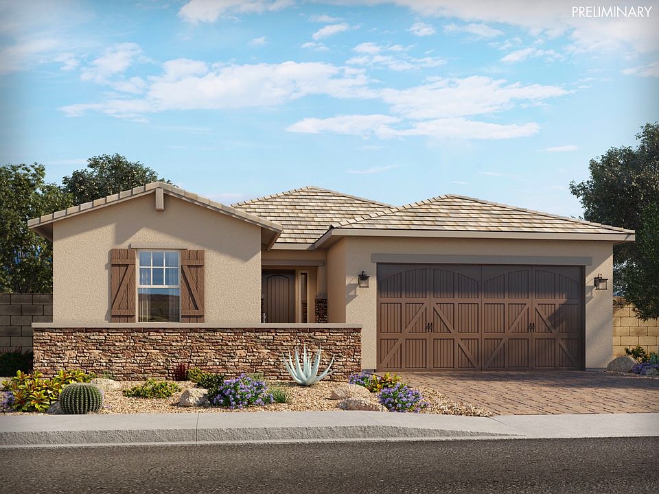 A unique single-story home featuring a social living area. Espresso cabinets with hardware, dusty white granite countertops, stone-look tile flooring and warm beige carpet in our Calm package.