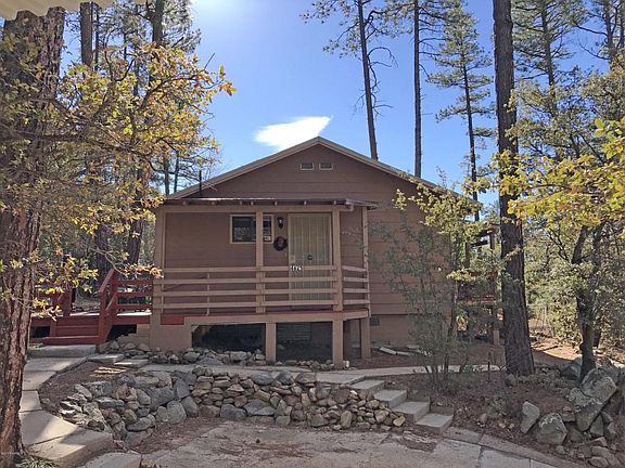 Adorable, fully furnished cabin, located in tall pines on nearly 1/2 acre. Bright open floor plan offers Wood floors & oak cabinets in kitchen, newer carpet in living/bedroom areas, wood built-in storage cabinets, newer hot water heater & heating/cooling system. Metal roof. Peaceful covered deck faces seasonal creek & private back deck. 1 carport. 2 large storage sheds. All paved roads...4 miles to shopping/5 miles to downtown Prescott. Walking distance to many hiking trails. Easy commute to Wickenburg & Phoenix. No HOA. Easy to rent short or long term.