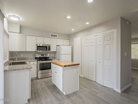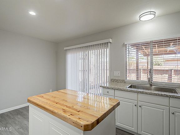 Conveniently located close to both the I-17 and I-10 freeways, this beautifully remodeled townhome is a perfect fit for anyone looking for a low maintenance lifestyle. This 4 bedrooms, 1.75 bathrooms is 1215 sq.ft. and feels much larger than that! The 2 tone updated grey paint and vinyl plank flooring, with white trim & doors throughout really gives the home a modern feel. From the front door, you enter a spacious great room with a ceiling fan. The kitchen is amazing & bright, and features white updated cabinets with stainless steel pulls, granite countertops, a deep basin industrial sink, with industrial spray faucet, a butcher block island (with food grade sealant) and cabinets with pull out drawers in the island, new stainless steel microwave and stove, and a white refrigerator,