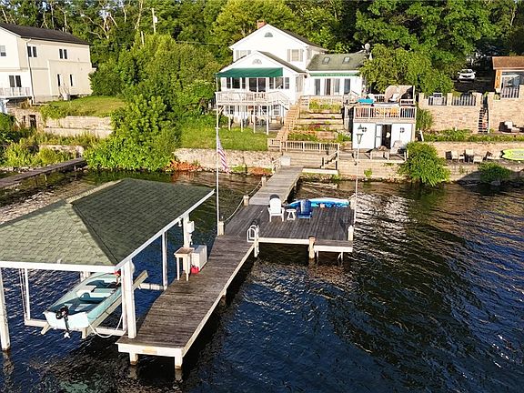 Don’t miss this Beautiful year round 4 bedroom home 2.5 baths with 83’ of frontage on the West side of Seneca Lake!! Lots of glass for the breathtaking views from every room. Stunning Sunrises! Enter from the foyer into the spacious vaulted family/dining room with cherry floors, gas fireplace and sky lights- opens to a deck with a retractable awning, Living room opens to a canvas covered deck with fan, 3 bed rooms 2 full baths upstairs, eat-in kitchen, first floor laundry/mudroom, first floor bedroom, large finished room in basement for the sports enthusiast or workout area, basement work shop area, central air, multi level decks, hot tub, dock, covered 10 ton boat boat hoist with remote control & leveling controls, partially fenced yard, detached two car garage, Newer aerobic septic system, public water, solar and EV. Charging station, close to shopping, HWS College & Hospital. Delayed negotiations July 21, 2024 at 12:00pm