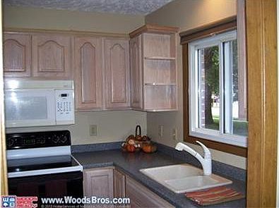 Completely updated end unit of 6 plex style townhouse. New kitchen cabinets, counters, sink & microwave. New bathroom cabinets, counters, sinks, stools & comb shower/tub. New carpet & vinyl. Laminate wood floors. Freshly painted. New ceiling fan, lights, patio & sidewalk by the 2 stall detached garage (20x22). Large Family Room w/wet bar in basement. 3 bedroom on 2nd. Small fenced yard (pets allowed). Brick & vinyl. 2011 Am Standard electric heat pump.