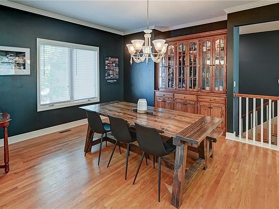 The main floor boasts hardwoods throughout, lots of windows to let in the natural light and big spaces. In addition to the formal dining room with its convenient built-ins, there is a formal living area featuring a two-sided gas fireplace, a large hearth room, eat-in kitchen area AND a large island for more casual dining. The abundant cabinets have all been custom painted and new hardware added. The kitchen features a single basin farmhouse sink, a gas cooktop and double oven.