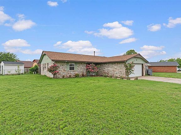 Affordable home in desired Sungate Addition! This home has approx. 1300 square feet, 3 bedroom, 1 3/4 bath and 2 car garage with privacy fenced backyard on a corner lot plus storage shed. New luxury vinyl flooring in the living room and carpet in bedrooms. Owner is leaving the refrigerator, washer and dryer and tv in the garage with the home. Give listing Julie Bridges, RE/MAX Professionals a call at 580 695-3883 with any questions.