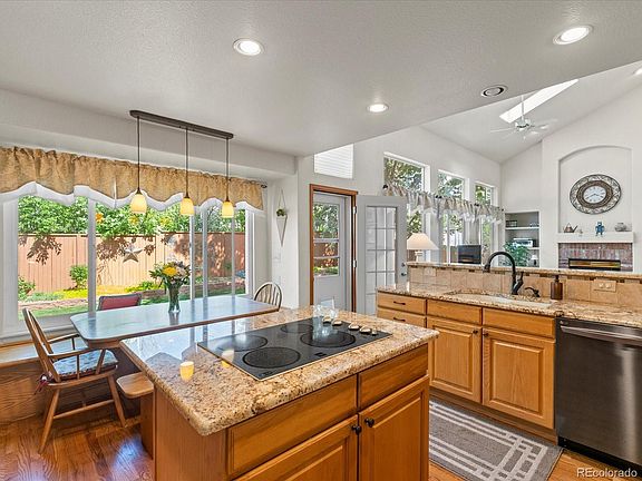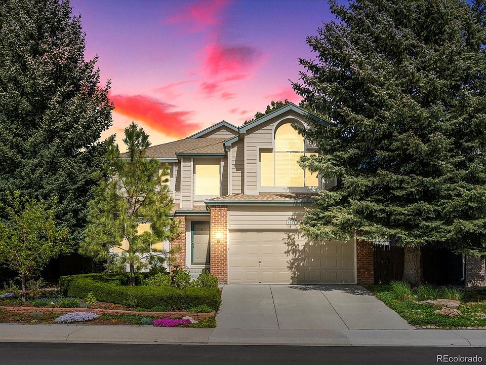 Fantastic updated home close to Founders Park in Castle Rock! You'll love entertaining family and friends or just relaxing in this exceptionally well maintained, former model home boasting almost 3,200 finished square feet of easy living space. As you enter the home you're welcomed by the spacious living and dining rooms and lots of sunlight from the bay windows. There's beautiful hardwood floors and newer carpeting throughout the main living spaces. Updated kitchen with breakfast nook features granite countertops, custom tile backsplash, recessed lighting, newer stainless steel appliances, double ovens and a center island with cooktop. Kitchen opens to the large family room featuring a brick accented gas log fireplace, vaulted ceiling, and an abundance of natural light from the wall of windows and skylights. There's also a main floor bedroom or home office and a 3/4 updated bath with granite countertop. Upstairs, escape to your spacious primary suite with a lovely ensuite remodeled bath featuring double vanity, custom cabinets, granite countertops, beautiful custom tile walk-in shower, tile floor and built-ins in the walk-in closet. There's also two additional good sized secondary bedrooms and an updated full bath with granite countertops, custom tile work and fixtures. Kick back and entertain guests in the spacious finished basement with built-in wet bar, custom entertainment center, an updated half bath, recessed lighting, and unique custom window wells. Enjoy quiet evenings from your large concrete patio in the beautiful fully landscaped yard featuring mature trees and an abundance of flowering plants and shrubs. There's also an automatic front/rear sprinkler system. Plus, you're just a couple minutes walk across the street to Founders Park, community pool and trails. The low HOA fee of only $50 per quarter includes pool access and trash pickup.**This property qualifies for a temporary 1% interest rate reduction! Call for details**