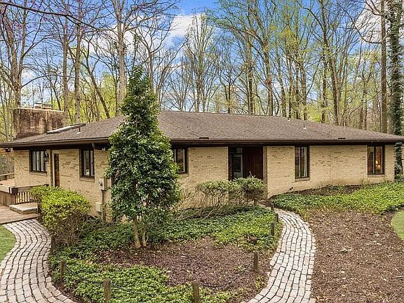 A custom walkway, crafted with original Monument Street cobblestones from Downtown Baltimore, leads to the front door and wraps around to a sprawling deck perfect for outdoor entertaining. Step into a bright and airy foyer that opens to a home filled with character and elegance. Rich hickory, marble, terrazzo, and stone flooring flow throughout, complemented by intricate woodwork, architectural moldings, and solid wood doors. The open-concept living and dining rooms are filled with natural light from expansive picture windows, offering serene views of the wooded surroundings. The eat-in kitchen is a chef's delight, featuring stainless steel appliances, granite countertops, a breakfast bar, recessed lighting, and generous prep space with direct access to the patio and backyard. The adjoining family room is a showstopper: bathed in sunlight from a soaring skylight, it showcases a dramatic floor-to-ceiling brick fireplace, ornate corbels, crown molding, and access to the outdoors bringing warmth and grandeur together in perfect harmony. A grand nm Iron Gate welcomes you to this exceptional all-brick Rancher, gracefully nestled on almost 4 acres of mature shade trees and lush landscaping. This unique property blends historic charm with modern comfort, featuring thoughtful details both inside and out.