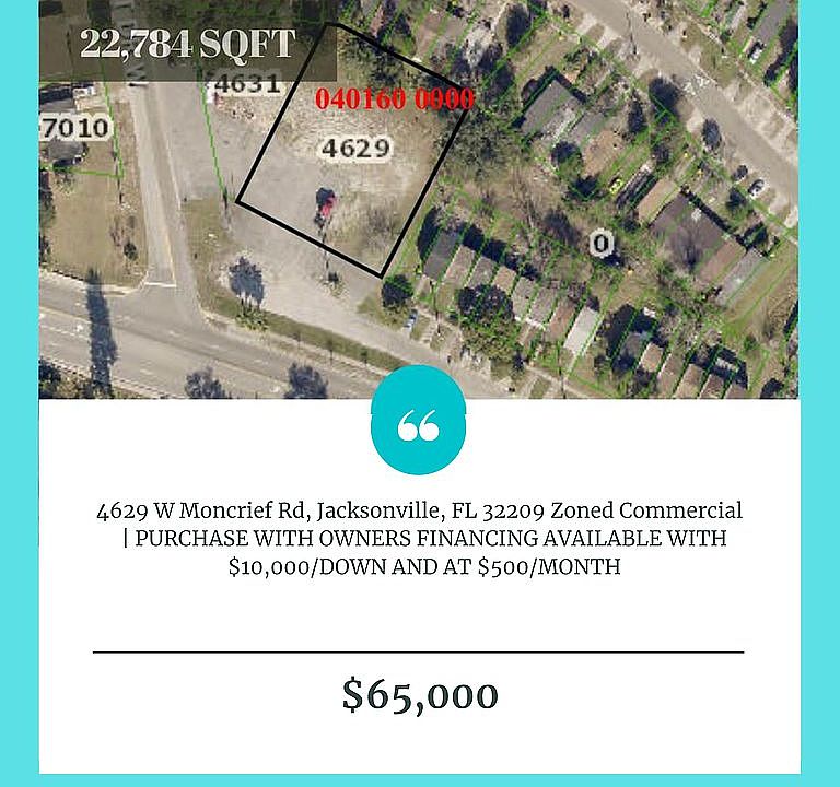 1/2 AN ACRE { 24,567 SQFT } COMMERCIAL VACANTT LOT ZONED - COMMERCIAL NEIGHBORHOOD {FOR MIXED-USE OF RESIDENTIAL AND BUSINESS} HUGE LOT ON CORNER AND OFF A BUSY MAIN STREET VERY HUGE POTENTIAL 4629 MONCRIEF RD W JACKSONVILLE, FL 32209 202-421-1433