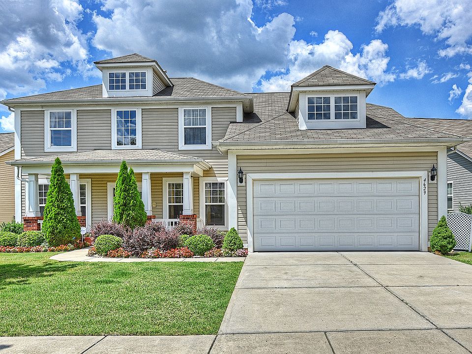 Dual Masters!!! Master on main plus additional Master upstairs. Wonderful curb appeal begins with nicely landscaped yard & inviting front porch. You will love the detail throughout this home. Columns,extensive crown moldings,hardwood floors,formal living & dining,2-story great room with custom draperies. Kitchen features new granite,tile backsplash & island. 3 additional bedrooms are large with plenty of space for work, sleep and play. Outside patio to enjoy your morning coffee, fenced yard,nice landscaping.