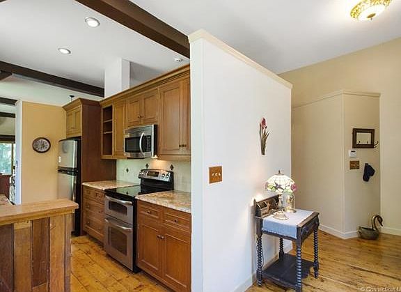 Historic waterfront home in an enchanting setting on the Farmington river. Experience breathtaking views from a house with a unique stone foundation featuring rocks from 49 states. Located conveniently within walkingdistance to cleared nature trails along the river and access to the Farmington river park. Watch the sunrise from a spacious deck attached to a three season porch. Enjoy fresh breezes in a riverside screened in gazebo adjacent to magnificent perennial gardens. This home has historic detailing and modern amenities. The open floor plan makes it ideal for entertaining. Main floor features original wide pine flooring, exposed wood beams, custom built in cabinets, wainscoating, central air and large brick wood burning fireplace.
