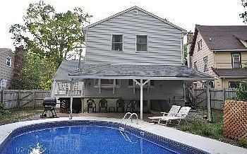 Spacious colonial with open floor plan and beautifully updated kitchen & baths, complete with hardwood floors throughout. Bay windows, wood burning fireplace, gas fireplace & built-in bookcases add to the charm of this conveniently located gem. Walk 1 block to NYC transportation. Tour the 4 large bedrooms all on 2nd floor - each with ceiling fan and ample closet space. Enjoy the natural light from the skylight in the master bedroom. Finished basement has 2 separate areas; one is currently being used as a 5th bedroom. Plenty of storage space in the basement. In ground pool and fenced-in backyard offer plenty of green space for recreational activities and entertaining. Perfect staycation! You won't want to miss this one! Sunday 7/2 OPEN HOUSE HAS BEEN CANCELLED