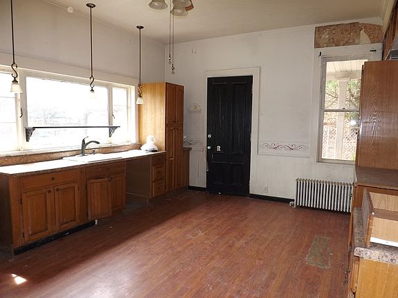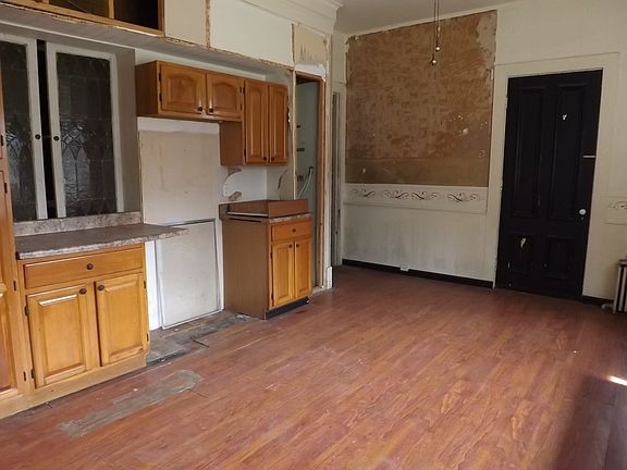 This stately home needs TLC. Spacious rooms, 9-10' ceilings throughout, wood floors, large windows - the potential is evident! Two parcels create a sizeable yard. Oversized garage/barn with an upstairs open storage area, first floor finished room and bath. Concrete driveway and parking area. Outdoor wood burner (status unknown) and canopy for wood storage. Property is being sold in "as-is, where-is" condition.