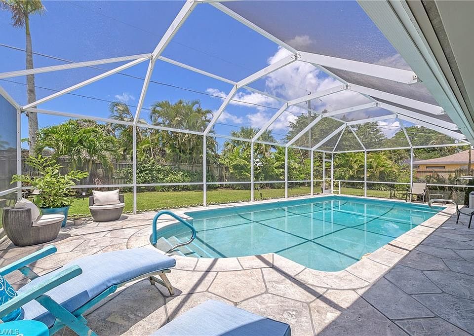 Your Florida dream home awaits! This 3/2 split floor plan in this highly sought after, quiet family neighborhood, in an A RATED SCHOOL DISTRICT, just became available in sunny Naples. The property boasts a private Landscaped Architect Designed yard and pool with BRAND NEW variable speed pool pump **energy efficient** and 2020 POOL HEATER, 2019 SOLAR PANELS, a relaxing paver patio and outdoor dining/sitting area with NEW 55" TV on lanai. Gorgeous mature landscaping with irrigations system, lemon, lime, key lime, papaya, and avacado trees. LG stainless steel appliances, newer plank-tile floors, 2022 WATER HEATER, newer AC, Upgraded 2021 HURRICANE IMPACT WINDOWS. Palm River has NO MANDATORY HOA! Boat and RV parking are allowed under Collier County Ordinance. Close to Mercato, Seed to Table, Hospital, Whole Foods, Trader Joes, Restaurants, Bars and Nightlife. Less than 10 minutes to white sandy beaches and spectacular, one of a kind Naples sunsets!!!