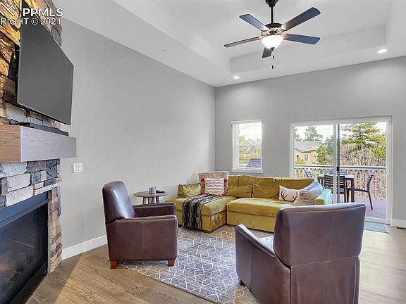Located on large .51 acres with mountain views overlooking large treed lot in the popular Star Ranch new build community. All the work is done including extensive landscaping with raised flagstone fire pit and lower level patio spanning the entire length of the home. This hard to find newer home in award winning school district 12 has amazing designer upgrades throughout. Hard to find all main living floor plan with second bedroom suite plus the master with spa like 5 piece bath all on the main level. Walk in to beautiful hardwood entry past spacious formal dining room into the sunny great room and white modern kitchen with every amenity. You will love the leathered granite counters, large island and stainless appliances in the kitchen with cozy eating nook overlooking park like yard. The lower walk out level has a massive family/game room with full wet bar including beverage cooler as well as two additional bedrooms with full bathrooms. The wonderful backyard perfect for entertaining and summer barbeques has large fire pit plus a fenced garden area for your summer vegetables. This is one of the nicest lots in the community. Currently one of the only active listings in the gated Star Ranch community. Close to Fort Carson, Schools , Shopping, Downtown, Restaurants and Cheyenne Mountain State Park while tucked away in a private mountain setting. See to believe this amazing home!