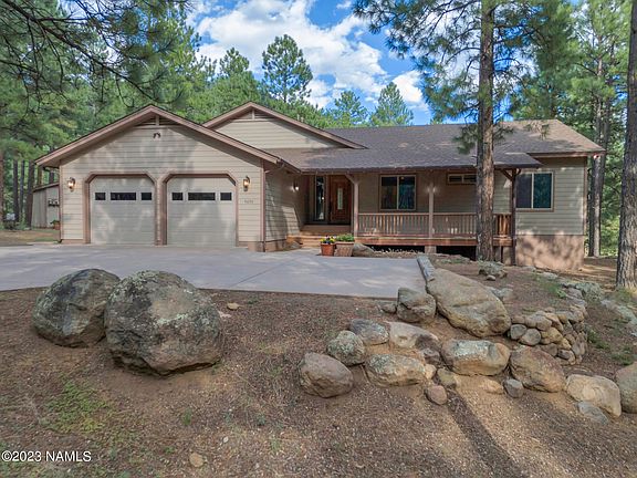 This stunning cabin perched on a gentle hillside on two forested acres is a Flagstaff Unicorn. Built by the owner, a custom luxury home builder, this single level Craftsman welcomes you with the perfect blend of luxury, comfort and nature. Enjoy the large open kitchen and greatroom with high ceilings accented by rich douglas fir wood beams and a stone fireplace. The wall of windows in the greatroom looks onto your spacious deck surrounded by pines. Feel the quiet and calm of the forest inside and out. Waking to a fresh coffee on your deck, the sun glimmering through the trees, or relaxing in the changing hues of sunset become easy, daily habits. Custom craftsman cabinets and thoughtful custom wood built-ins, hickory floors, douglas fir beams on the outdoor ceiling, central air and a private, high-producing well make this your favorite, perfect setting for all seasons. Walk or bike the endless trails nearby in the Schultz Pass area from your doorstep. Drive to downtown Flagstaff or Snowbowl, you are only minutes away from each. If you almost stopped believing in the Flagstaff unicorn - a beautifully designed and appointed, meticulously cared for luxury cabin in the woods that allows peace and privacy, on a deep well, with easy access to Flagstaff's best amenities, then it's time to believe again. It's here.