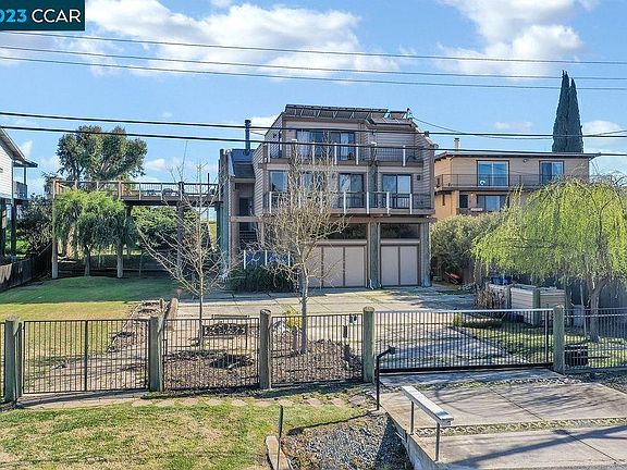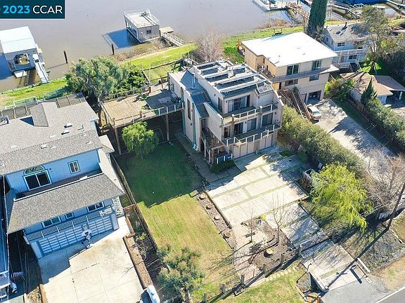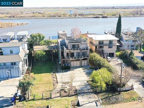 A Bethel Island estate on the water with stunning views and sunrises on this incredible home and location. The seller will throw in the lot next door with a separate APN & the boat (18 ft Party 24 DLX Barge pontoon boat, year 2018). Two properties for the price of one. Let’s not forget the Boat House with private deck for sunbathing. A 3 story, split level home with an automatic security gate, 60 seconds away from “FAST WATER” or “DEEP WATER” which means access to the Golden Gate Bridge and miles of Delta waterways. 3-car garage (extra deep & extra wide) & a SOLAR lease. An elevator from garage to main house. Massive deck system overlooking the water & sunrises. 3 bedrooms, 2.5 baths, 2,500 sqft home. The primary BR is a large loft style setup, primary bath has a separate shower & tub and a walk-in closet. The 2 guest bedrooms share a full bathroom on another level of the house for the kids or guests. Included: Refrigerator, washer & dryer, hardwood floors, large skylights with auto window shades, wood burning fireplace, multiple sliding doors to access the decks, natural wood doors & trim and beams throughout the open floor plan. The kitchen: tile counters, a gas stove, double ovens, microwave, dishwasher, refrigerator (room for side-by-side freezer), breakfast bar & wet bar.