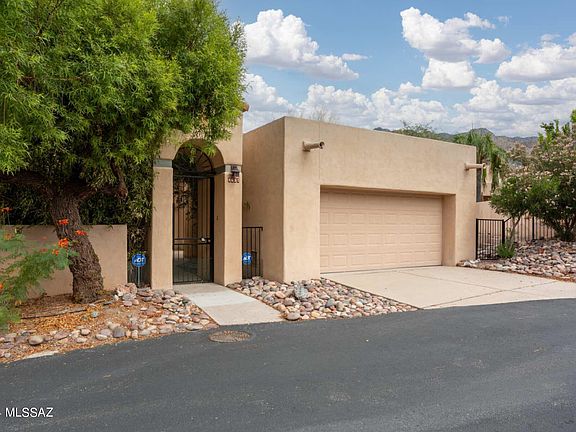 Prime Location in Central Foothills: This charming home is situated in a sought-after gated community, offering stunning views of the Catalina Mountains. The community is impeccably maintained, and the townhome features a serene courtyard and a low-maintenance backyard patio. The property includes a two-car garage with custom-built storage cabinets.Spacious living area with vaulted ceilings and elegant chandeliers. Granite countertops, modern appliances, a skylight, and a cozy breakfast nook in kitchen. Living room features large windows and a sliding patio door.Open floor plan includes two large bedrooms/two bathrooms. Master suite offers a walk-in closet, double sinks, and a sliding door leading to the backyard. Laminate flooring throughout. Immaculately clean and move-in ready.