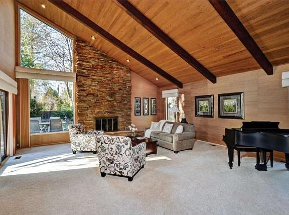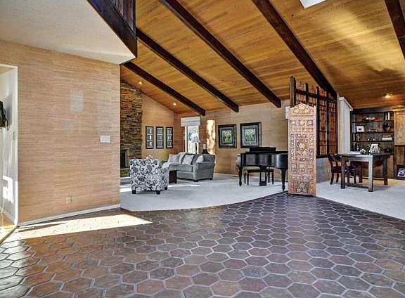 A unique & irreplaceable setting, nestled on coveted Hillcrest View Drive, across from the golf course! Meticulously landscaped grounds & stone pathway lead to the ~3720sf residence, original design with Sun Valley panache. The layout of the main-level provides a seamless flow for entertaining from the large great room w/ built-in bar, through the gourmet kitchen & into the formal dining room. Beautiful grass cloth covered walls add vintage character & are complemented by a floor-to-ceiling stone fireplace.