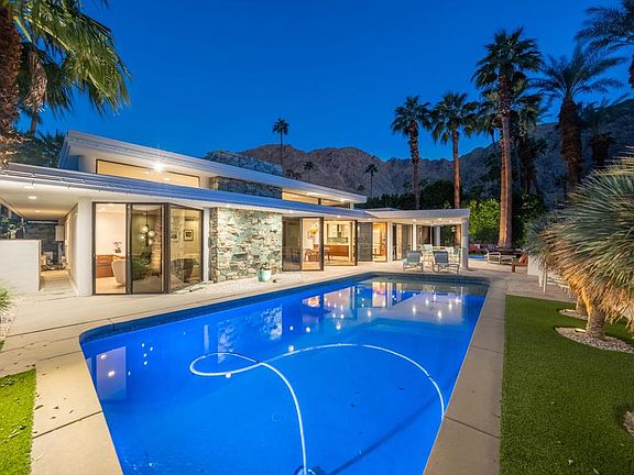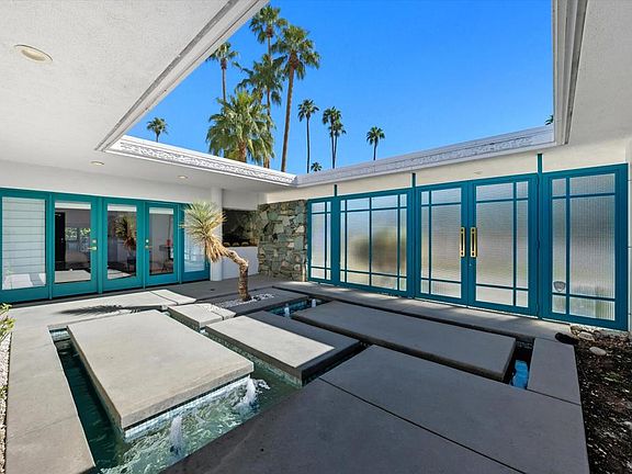 Stunning 1963 Mid-Century Modern, remodeled in 2019, captures expansive South Mountain and Indian Wells Fairway views while offering exceptional privacy. The front elevation with iconic Utah Jade stone facade and circular drive are immortalized in a Carrie Graber artwork, available at Coda Gallery, which sets the tone. A front courtyard wall of obscure glass provides natural light, privacy and leads to the main entry, Casita, and Guest suite. Mid-Century imagination comes alive with the geometric concrete water feature which is the courtyard floor. Inside, the Great Room impresses with a dramatic wall of angular glass and transom windows spanning the width of the home. Flagstone flooring flows throughout, anchored by a striking Utah Jade fireplace. The Great Room with a wet bar, large kitchen, and Primary suite open to the pool, spa and large patio with sweeping views of the South fairway and mountains. The flexible Media Room includes a large screen TV, a 3/4 bath and could serve as a 4th bedroom. A see-thru fireplace connects to the spacious en-suite Casita with private entry and offers a romantic element. Both the Primary and Guest suites enjoy remodeled baths with large showers. The 2019 renovation offers owned Solar electricity and showcases walnut cabinetry, custom shades, quartzite counters, high-end Blue Star appliances, a Thermador wine cooler, and a well-appointed kitchen with a generous island which opens to a covered patio area perfect for dining.Resort-style outdoor living includes a pool with tanning shelf, spa, two fire pits, built-in BBQ with dining counter, and a large covered patio with redwood bench seating, perfect for large parties. A 2-car plus golf cart garage has just been refinished with epoxy flooring. Large side hedges separate this from the neighboring homes for privacy. This beautiful home is offered furnished per inventory and, ready for immediate occupancy. Located in Indian Wells Country Club behind the Manitou Gate, with low HOA dues and enjoys all the Indian Wells perks offered to residents.