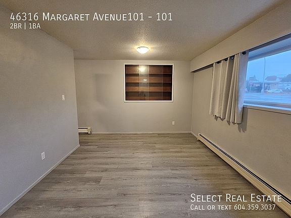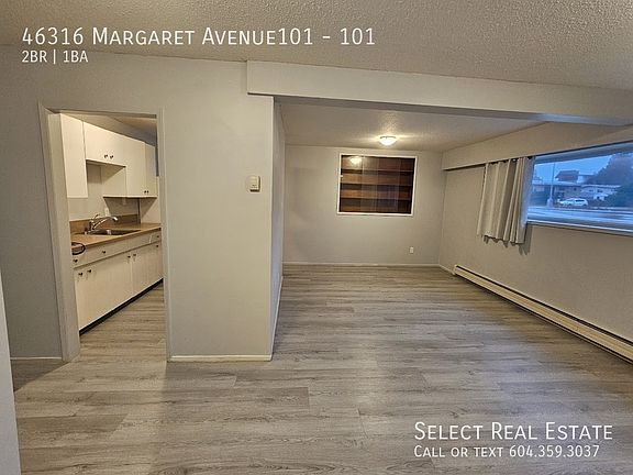 Address: 101 - 46316 Margaret Avenue, Chilliwack, BC V2P 2H1 Date Available: August 6th, 2025 This unit is located on Margaret street. Close to downtown, schools, shopping and recreation centers. Entering into the unit you will find a huge living and dining area, galley kitchen with fridge and stove. Down the hall is the bathroom and 2 bedrooms as well as a large storage room. Large entry closet provides ample storage space. Laundry is in building and plenty of out-door parking and easy access to the unit from both the front and back of the building is available. Lease Details Lease duration: 1 Year Security Deposit: Months Rent Pet Deposit: Months Rent (if applicable). No Smoking Property Details Bed: 2 Bath: 1 SQFT: 1100 Pet Details Pets(Yes/No): Yes Type Allowed: Any Number: 2 Size Restriction: Small Pets Only Exterior Details BBQs allowed(yes/no): No Parking type and how many: Parking Lot out front - 1 spot then street parking Yard Usage: N/A Yard fully fenced: N/A Shed Or Shop Usage: N/A Appliances Included Fridge: Yes Range: Yes Dishwasher: No Microwave: No Washer/Dryer: Yes Shared Laundry: Yes Pay Laundry: No Fireplace: No Air conditioner: No Standalone freezer: No Utilities Gas: N/A Hydro: 100% Landlord Internet/Cable: 100% Tenant Water, Sewer, Garbage: 100% Landlord Utility Type Heat Source: Electric Baseboard Septic/Sewer: Sewer Water Source: City Tenant Responsible for Septic pumping: No