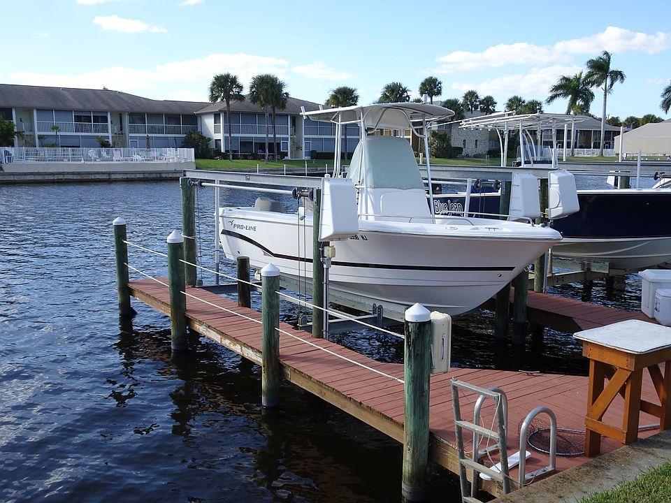 This well maintained, Gulf Access, ground floor 2/2 condo has a deeded boat dock and 8,500 lb boat lift on the 200' Rubicon Canal. The condo features new large tiles thru most of the unit, and many of the furnishings are included in the sale. The large community pool overlooks the water. The spacious covered lanai has two storage closets (one with washer/dryer). The entire unit has been extremely well maintained from the building to the parking lot to the dock and also your own boat lift. The community has pavered walk ways and mature tropical landscaping. This condo has a storage shed in front of the unit. The guest bedroom has a pair of Murphy Twin Beds. The condo building has been re-plumbed. This condo is located near Downtown shopping,restaurants and also close to Cape Coral Yacht-Club and fishing pier. Please see attached virtual tour to appreciate this beautiful condo.