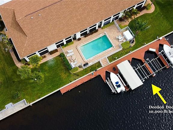 Enjoy Florida living at it's best from your very own private lanai overlooking the 200 ft. Rubicon canal! This 2/2 waterfront, Gulf access condo has stunning water views and a deeded dock with a 10,000 lb. lift! Featuring a split bedroom floor plan, this condo is perfectly situated on a Western exposure providing you with a nightly view of those spectacular Florida sunsets! The spacious screened-in lanai spans the length of the condo and has plexiglass panels, so you can open the sliders and have an added air conditioned space in the summer months. With some updating and a decorator's touch, this condo has AMAZING potential and is waiting for a new owner to make it their own! The community is excellent: grounds are very well taken care of, there is a community pool & BBQ grill, along with the community dock. The roof and gutters were just replaced in 2018 and the building was painted in 2019. Each unit has an assigned covered parking space and additional storage as well. One of the best features, is the proximity to our revitalized downtown area! Downtown Cape is expanding and there are tons of new dining options, entertainment and shops within a mere 10 minute walk!