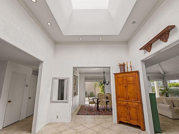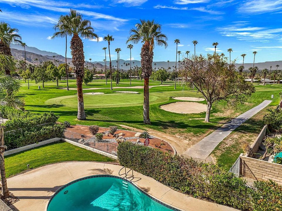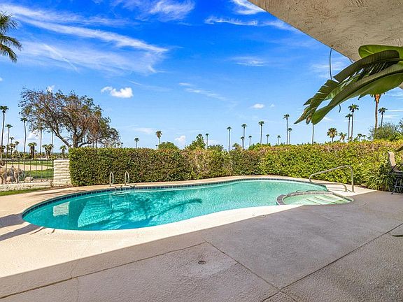 A condo with nearly 2,000 SF. AND a private pool in the heart of South Palm Desert? Yes please! Act fast on this rare and ultra-charming condo featuring 2 bedrooms PLUS den or optional 3rd, 2 bathrooms, vaulted ceilings, and gorgeous atrium! This property is tucked nicely off the street in a small collection of only 5 large condo homes but not all have the view this one does! This location is front row to the Shadow Mountain golf course, and offers panoramic mountain views and treetop/city light views! The floor plan offers nice bedroom separation for privacy, a galley-style kitchen, dining area with adjacent bar/counter to kitchen, and cozy living room with fireplace. This gem is light and bright with windows and sliders throughout. Your kitchen is outfitted with stainless steel appliances including a wine fridge, and lovely granite slab counters. There is a lot of storage in this property and it also comes with a stackable washer and dryer! The primary suite is spacious and has dual sinks, shower stall, and access to your yard with a private pool and spa. Designated carport and single car garage. HOA dues include landscape both in the front and back yard, exterior maintenance including roof, and structural/earthquake insurance .