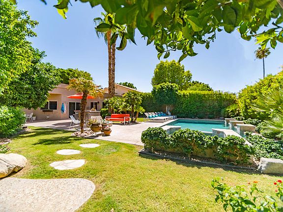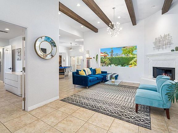 Proximity to schools will draw you in. The mountain view will make you stay. The plus of this home is that you have many options for it and NO HOA: A primary home, weekend getaway, or investment purchase. And it's turnkey furnished so that you just move right in. From the time you walk into this home a big window gives you the view of the large back yard and gorgeous mountain. High beamed ceilings and spacious floorplan are sure to give you the freedom to relax, enjoy, and live the great Palm Springs lifestyle whether indoors or out. Take advantage of the billiard table and being right in the middle of all the action as someone prepares food, in the living room relaxed by the fireplace, or is outside enjoying the outdoor space. Large primary bedroom and bathroom suite with two additional bedrooms and a bath on one side of the home and a separate bedroom and bath on the other side of the home. The oversized direct access garage has epoxy floors, storage space, and laundry. Now let's go outside and experience the numerous ways to enjoy privacy! A built-in BBQ and sitting area where you can entertain, a dining area for cocktails and food, or the large pool and spa with waterfall, lounging area, fire feature, citrus trees, and so much more. This is the house you will call home.